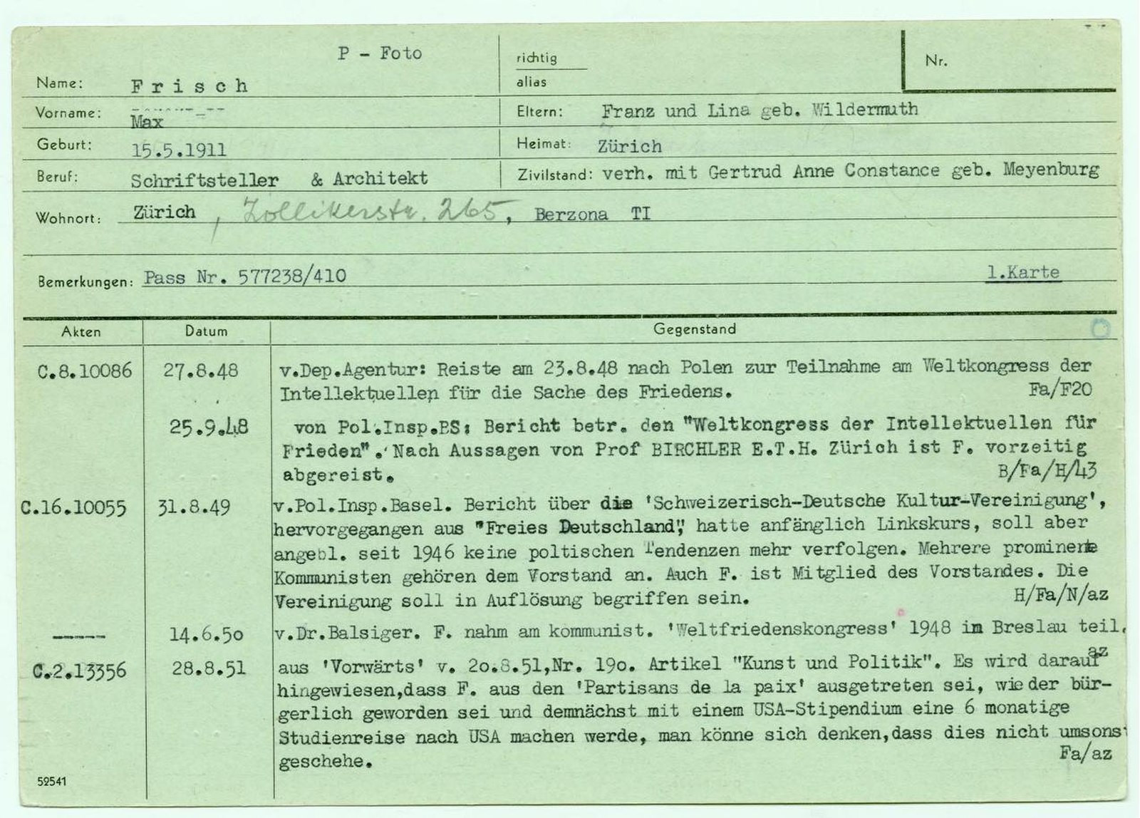 Fiche vom Schweizer Autor Max Frisch (Bild: Schweizerisches Bundesarchiv)