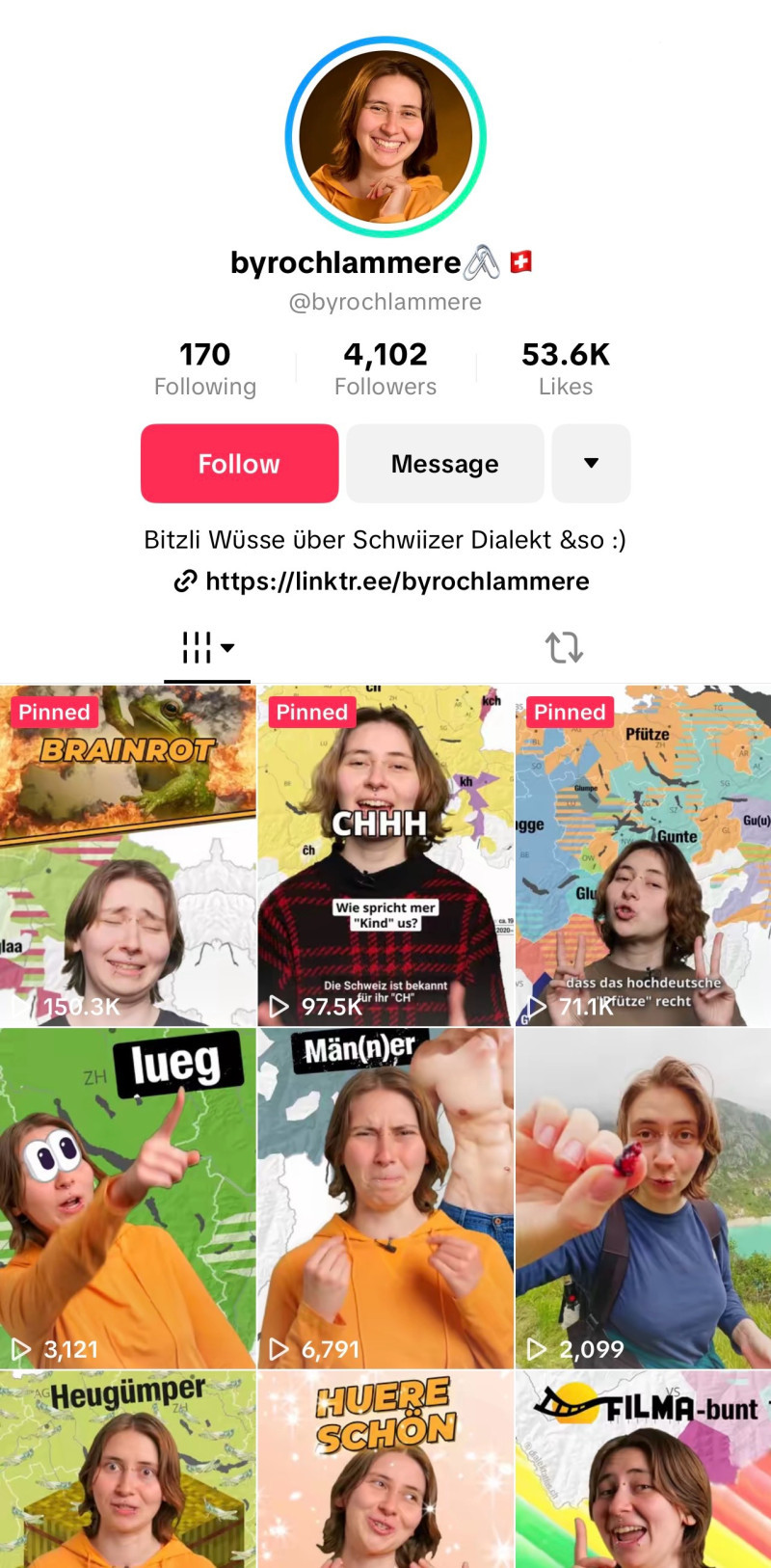 So beginnen die meisten Videos von Nadja auf ihrem Kanal byrochlammere. Ihre Begeisterung für Dialekt ist riesig, sonst würde sie diese Videos nicht machen. Sie erklärt Wörter in Mundart und wieso wir in der Deutschschweiz den Dingen oft ganz anders sagen, je nach Kanton oder Gebiet. Da kommen jeweils die wildesten Kombinationen zusammen.