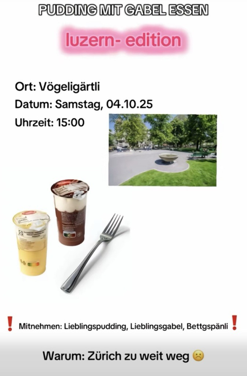 Der ganze Spass «Pudding mit Gabel essen» hat in Deutschland angefangen. Dort wurden anfangs August diverse Flyer verteilt, die dazu aufgerufen haben, Pudding mit der Gabel zu essen. Auf diesen Flyern stand ein öffentlicher Standort, der für alle zugänglich ist. Mitnehmen: Gabel und Pudding. Diese Flyer wurden dann auf Social Media geteilt und haben extrem viel Aufmerksamkeit bekommen. Tausende von Leuten haben sich dann getroffen, bewaffnet mit Gabel und Pudding, und sind zu solchen Treffen gegangen. Alle sitzen in einem Kreis, klopfen auf den Pudding und dann wird gegessen.