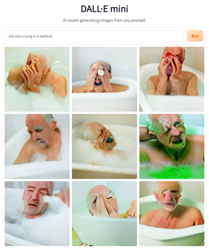 Hast du dich schonmal gefragt, wie es aussehen würde wenn eine K.I. irgendwelche Begriffe zu einem Bild zusammenschmelzen würde? Genau das macht das Tool DALL-E Mini. Als Experiment haben wir die Begriffe "old man crying in a bathtub" und "goose murdering a pigeon on a skyscraper". Nach einer Weile spuckt das Programm dann (meistens) passende Resultate aus.
